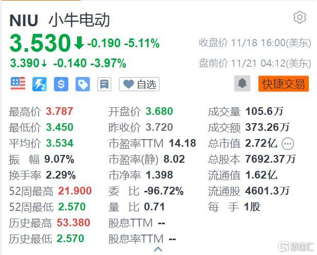 格隆汇11月21日丨小牛电动(NIU.US)盘前跌3.97%,报3.39美元。小牛电动发布2022年第三季度财报,报告期内实现营收11.53亿元,同比下降6%;净利润290万元,上年同期净利润9170万元,同比下降96.84%;调整后净利润2020万元,上年同期净利润1.02亿元,同比下降81.2%。报告期内电动滑板车销量320798辆,同比下降19.2%。其中,中国市场电动滑板车销量263178辆,同比下降32.9%;国际市场电动滑板车销量57609辆,同比增长1059.8%。截至9月30日,中国市场加盟店数量3303家。小牛电动预计,第四季度营收将介于7.89亿元至9.86亿元之间,同比降幅为0%至20%。