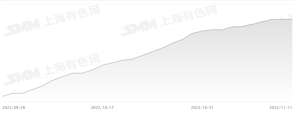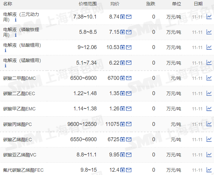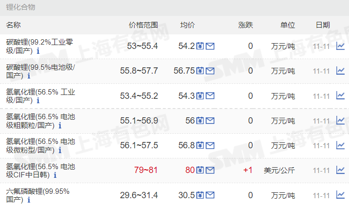 根据上海有色网数据,截至11月11日,电池级碳酸锂均价56.75万元/吨,工业级碳酸锂报价54.2万元/吨;电池级氢氧化锂(56.5%国产粗颗粒)报价56万元/吨,工业级氢氧化锂报价54.3万元/吨。三元材料方面,523多晶、523单晶、622多晶、811多晶分别报每吨34.3,35.25,35.75,40.4万元。