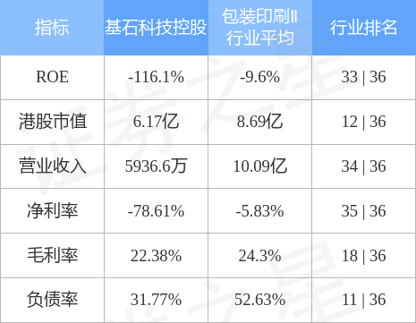 基石科技控股港股市值6.17亿港元,在包装印刷Ⅱ行业中排名第12。主要指标见下表: