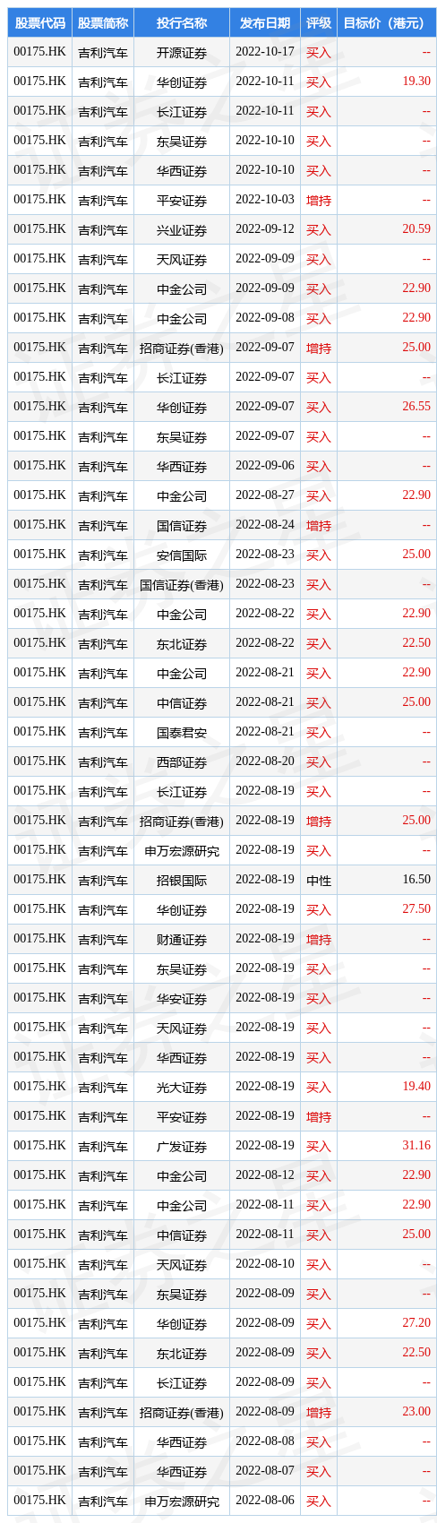 截至2022年11月1日收盘,吉利汽车(00175.HK)报收于9.02元,上涨6.87%,换手率0.74%,成交量7444.37万股,成交额6.59亿元。投行对该股的评级以买入为主,近90天内共有42家投行给出买入评级,近90天的目标均价为23.54。开源证券最新一份研报给予吉利汽车买入评级。