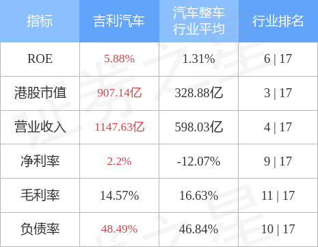 吉利汽车港股市值907.14亿港元,在汽车整车行业中排名第3。主要指标见下表: